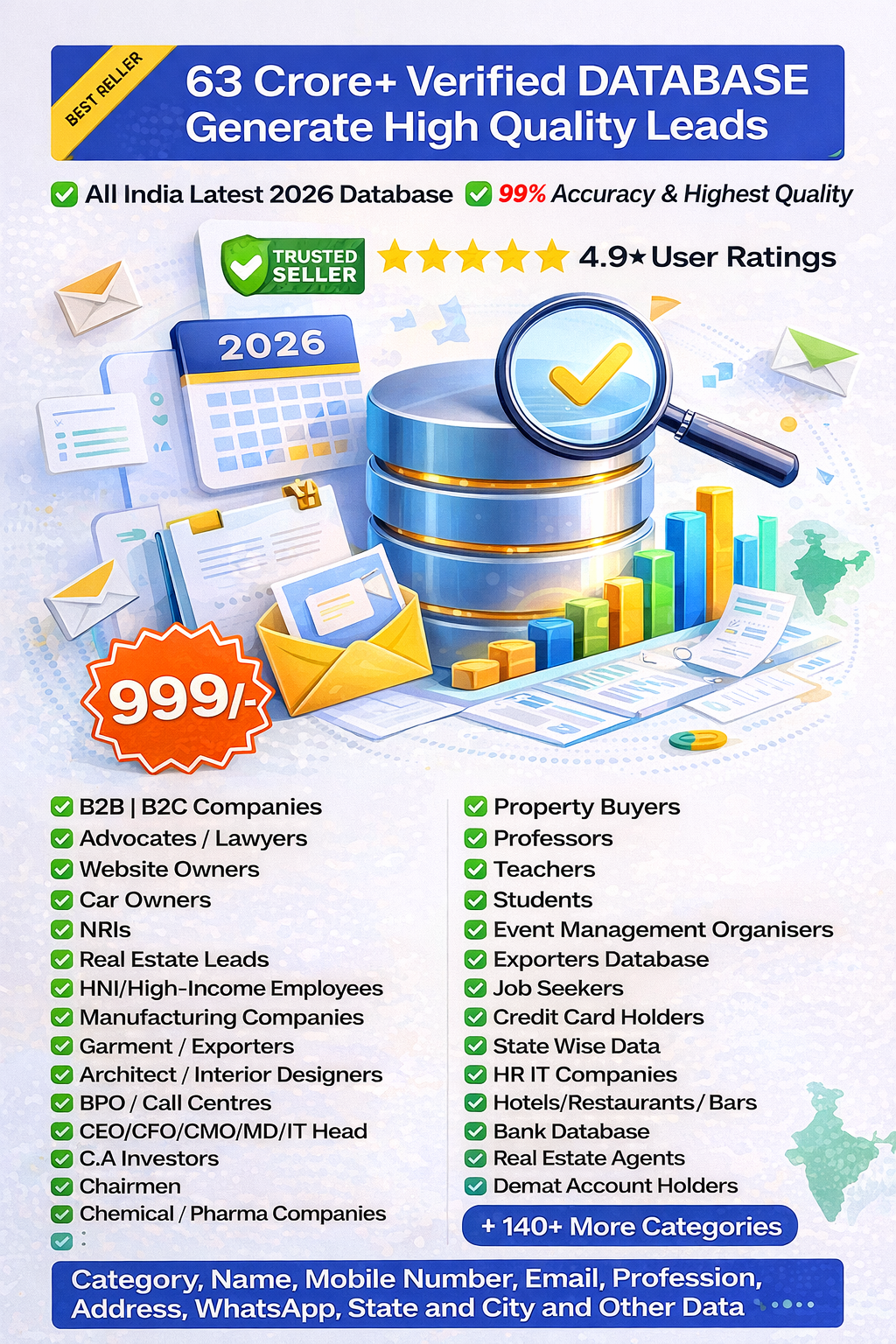 Download 63 crore verified contacts in Excel CSV format. Sorted into 447+ categories like Real Estate, HNIs, Doctors, Students, and Business Owners.
